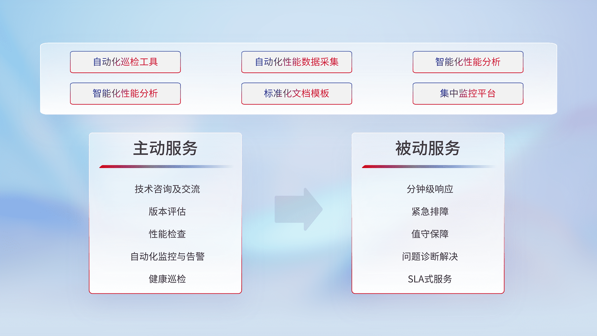 智能化工具和标准化文档,,保障服务质量,,提供主动服务(包含技术咨询、、版本评估、、、性能检查、、、、自动化监控与告警、、、健康巡检)和被动服务包含(分钟级响应、、、、紧急排障、、值守保障、、、问题诊断解决、、、SLA服务)。。